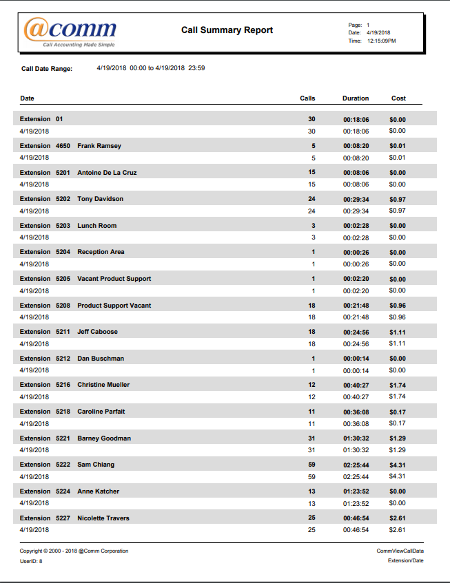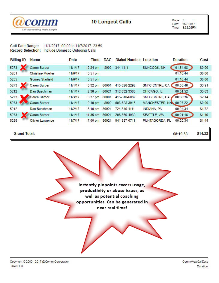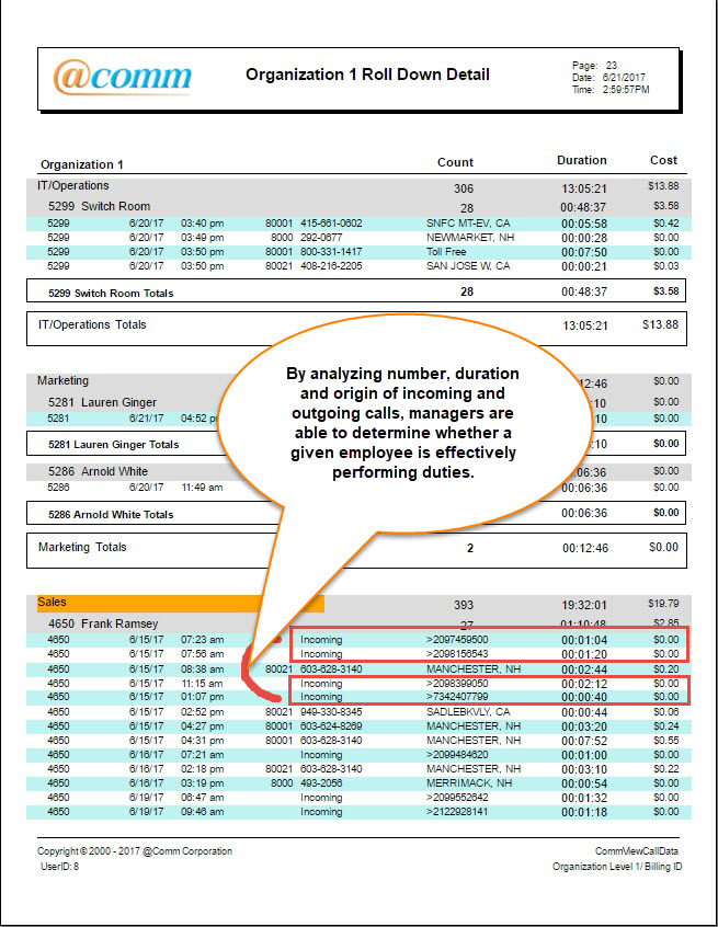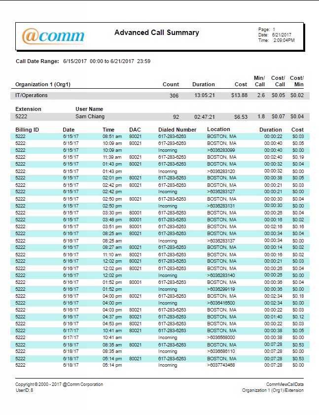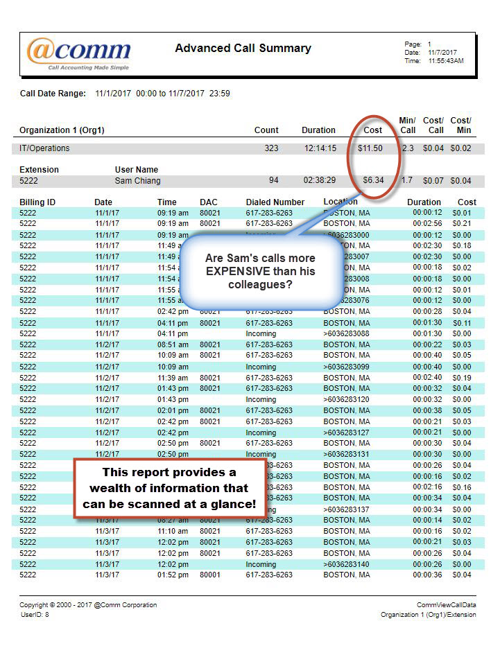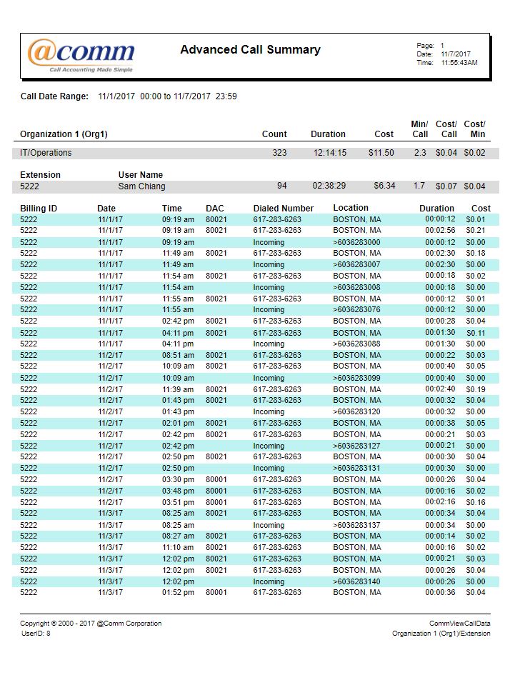 As businesses and organizations are structured into hierarchical groups, there tends to be subdivisions that may also need to be reported on for budget or organizing purposes. This report can break phone call data down into these desired subgroups and display them aligned with original data for easy analysis.