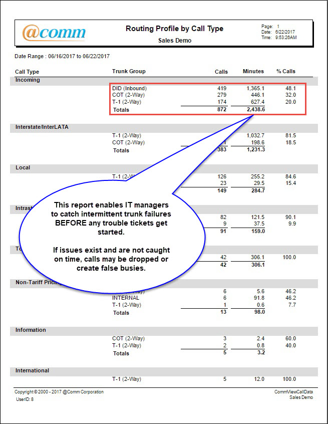 Provides insight into Call Types, Trunk Groups, Calls, Minutes, and Percentage of calls. This report also has drill down capability on all values. Understanding call routing becomes essential to the health of the business as technology changes, carriers expand and more. Having a deeper understanding of call routing can also help with budget requests and informing non-technical audiences.